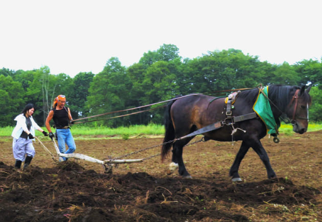 馬愛に溢れるご夫妻が現役を引退した競走馬や行き場のない馬たちと生活しています。十勝の開拓時代の馬耕を体験し、人と馬との共生の歴史について学びます。