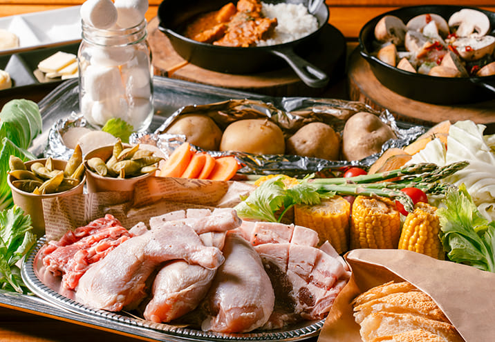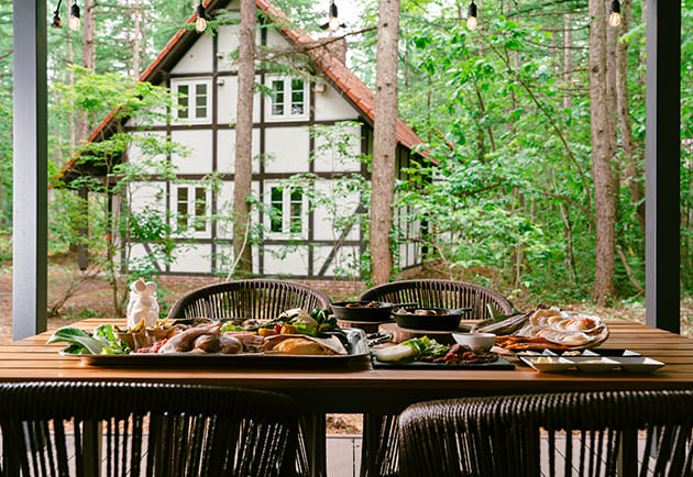 森林の中にあるコテージまたはグランピングにてお泊りいただきます。夕食には、地元産の山海の幸、畑の恵みなどの炭火バーベキューをご賞味いただきます。歩いて約5 分、モール温泉と本格フィンランド式サウナもお楽しみいただけます。(季節により野菜・卵収穫体験も可能)