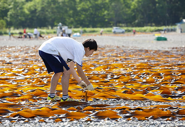 広尾町では昔から代々伝わってきた変わらぬ方法で天然の昆布を獲る昆布漁が行われています。現役の漁師からレクチャーを受けながら、昆布干しを体験いただきます。