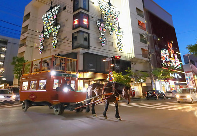 帯広競馬場で活躍したばん馬が曳く馬車ツアーです。地元素材のクラフトビールやおつまみをお供に、賑わい溢れる夜の中心市街地を50分程かけて巡ります。
